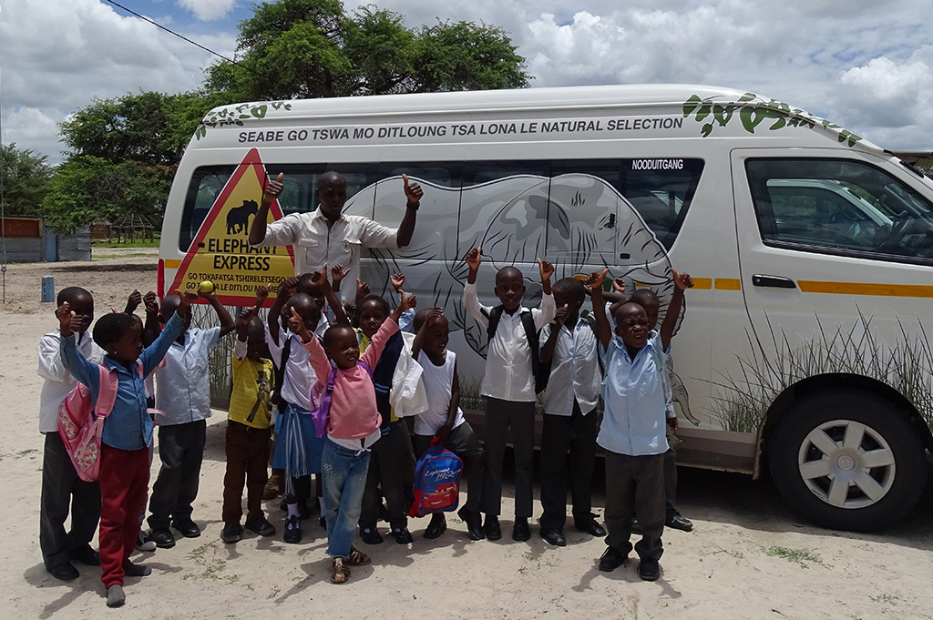 The Elephant Express buses were developed after community consultations highlighted the need for safe transport in areas with high elephant densities. In partnership with EcoExist and the Okavango Community Trust, and with insurance provided by SATIB and the Botswana Insurance Company, we support three buses that transport children safely to school and assist elderly or vulnerable community members in reaching clinics during the day.